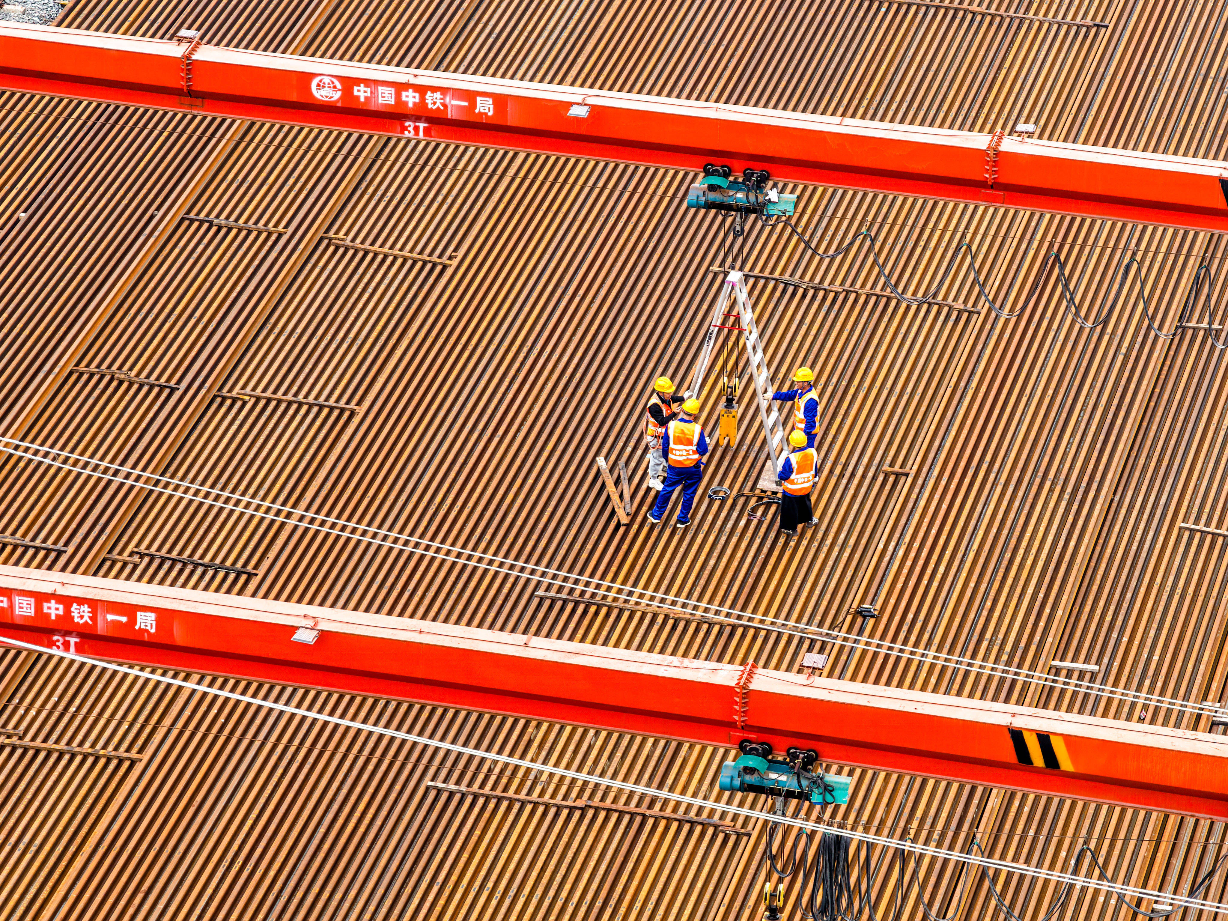 4月3日,工人在渝万高铁全线铺轨工程现场施工作业(无人机照片)。新华社记者 唐奕 摄据了解,目前渝万高铁路基、桥梁、隧道等线下工程已基本完成,站房及“四电”工程正按节点有序推进。铺轨节点的如期实现,标志着项目从线下工程全面转入线上施工阶段,为全线按期通车奠定坚实基础。