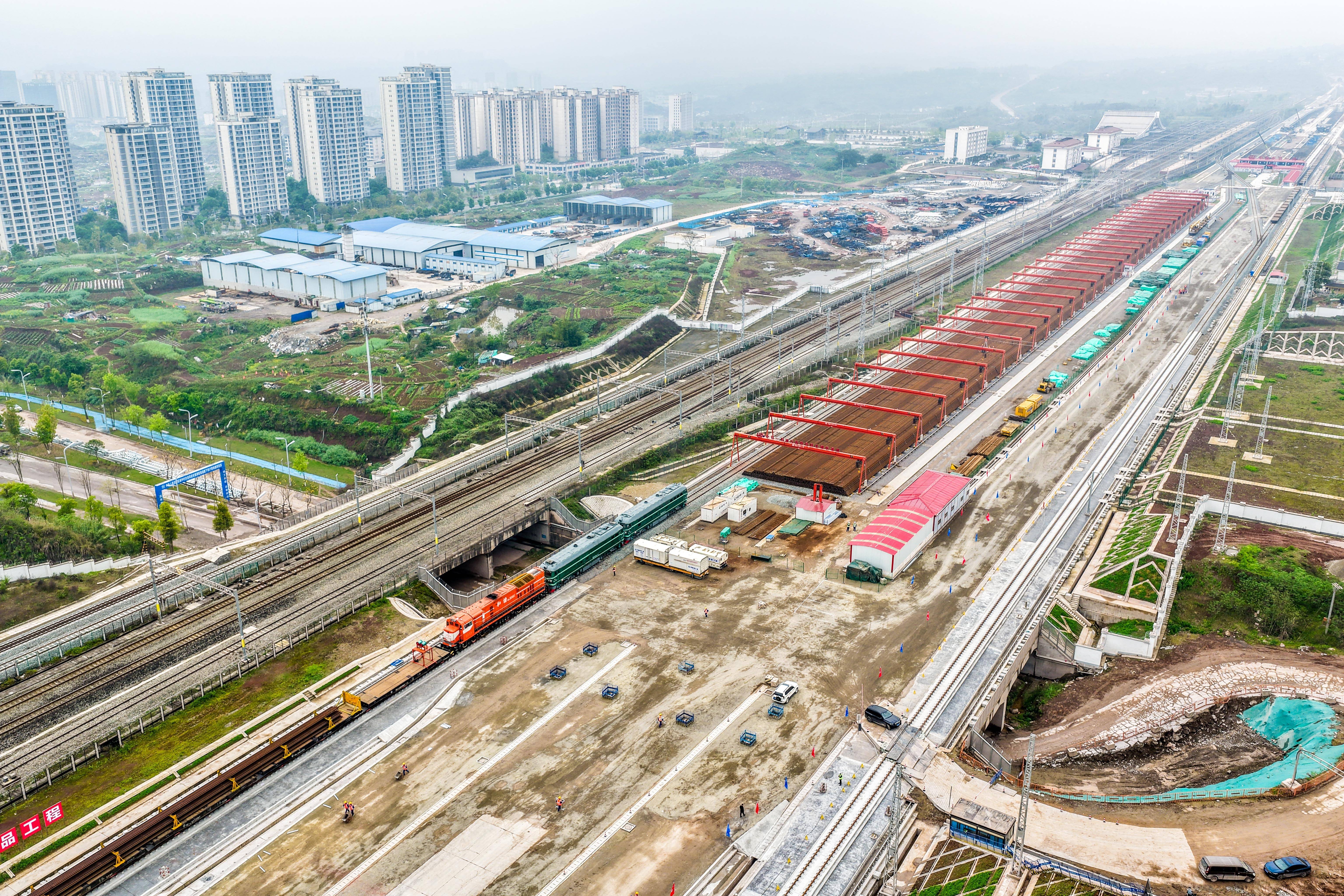 新华社重庆4月3日电(记者唐奕)3日,在重庆市涪陵区涪陵北站施工现场,首对500米长钢轨从新型多功能长钢轨牵引车上稳稳铺下,标志着新建重庆至万州高速铁路(以下简称“渝万高铁”)全线铺轨工程正式启动。